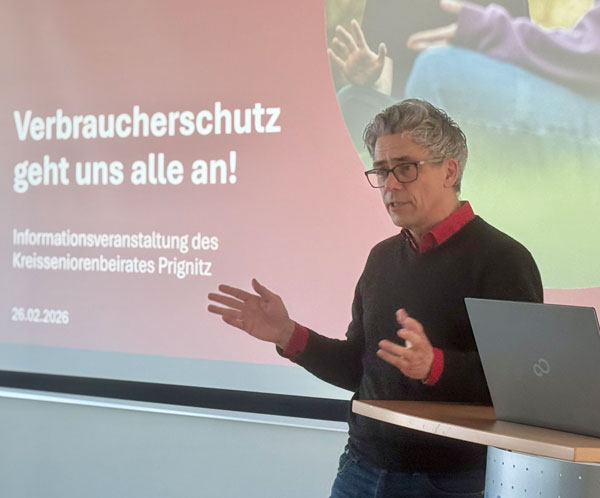 Egal ob nun Matratzen, unberechtigte Inkasso-Forderungen oder untergeschobene Verträge – Janneck kennt so ziemlich alle Maschen, mit denen versucht wird, den Menschen das Geld aus der Tasche zu ziehen. Er leitet die Verbraucherberatung bei der Verbraucherzentrale Brandenburg. Umso mehr freut es ihn, dass er am 2. März 2026 unter dem Titel “Verbraucherschutz geht uns alle an!” sein Wissen bei einer Informationsveranstaltung des Kreisseniorenbeirats Prignitz weitergeben konnte.
